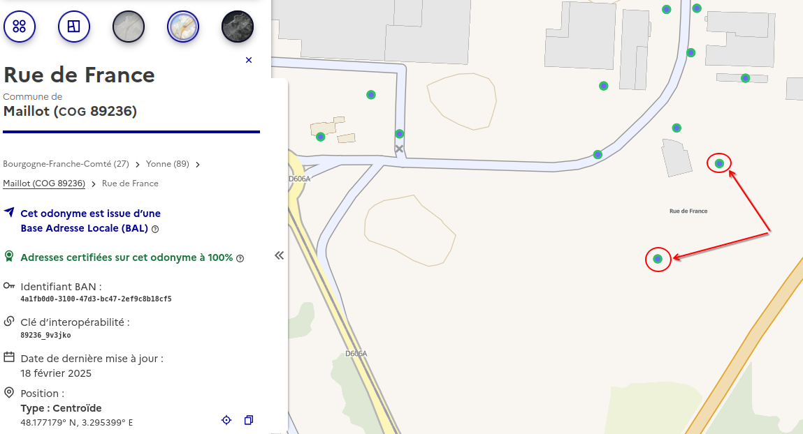 La commune de Maillot (Yonne) a récemment dénommer une nouvelle voie et créer des adresses sur un nouveau lotissement en construction. Problème, la voie en question n'est pas tracée. Il s'agit de la Rue de France, absente des fonds de plan (OSM, IGN et vue aérienne), même si l'on distingue la voie sur la couche du cadastre :
