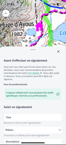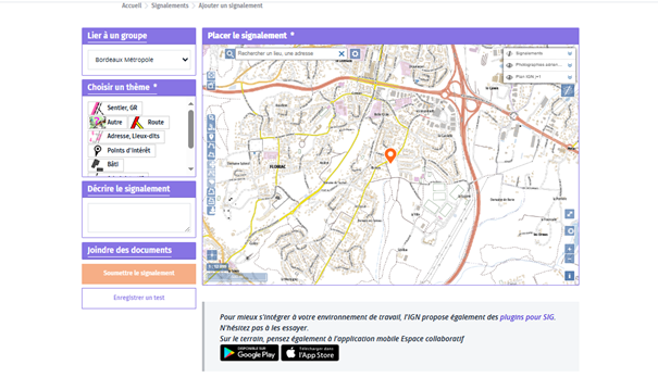 L’espace collaboratif Espace Collaboratif IGN propose un ensemble de services et d’API pour les professionnels de l’information géographique. Cet espace permet de signaler et, dans certains contextes, d’écrire directement dans les différentes bases de données éditées par l’IGN. Accessible par plusieurs canaux (web, SIG, mobile) il permet aussi de voir les signalements émis par d’autres contributeurs, de voir l’état d’avancement du traitement de chaque signalement émis, de créer des groupes sur des sujets particuliers de contributions et de les administrer.