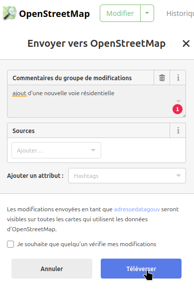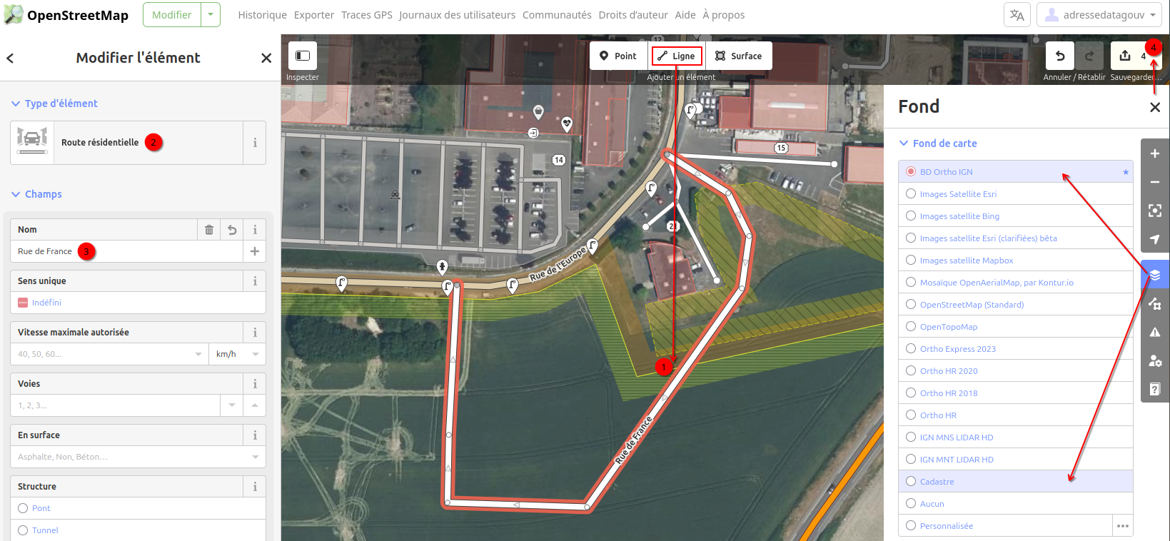 Sans attendre la mise à jour de la vue aérienne (il peut s'écouler plus d'une année avant que cette photographie soit à jour), nous pouvons tracer cette voie sur https://www.openstreetmap.org/. Une fois connecté, en nous aidant éventuellement du fond de carte "cadastre", nous allons : 1/ tracer la ligne de la voie, 2/ caractériser le type de voie puis 3/ saisir le nom de la voie, et enfin 4/ téléverser nos modifications :